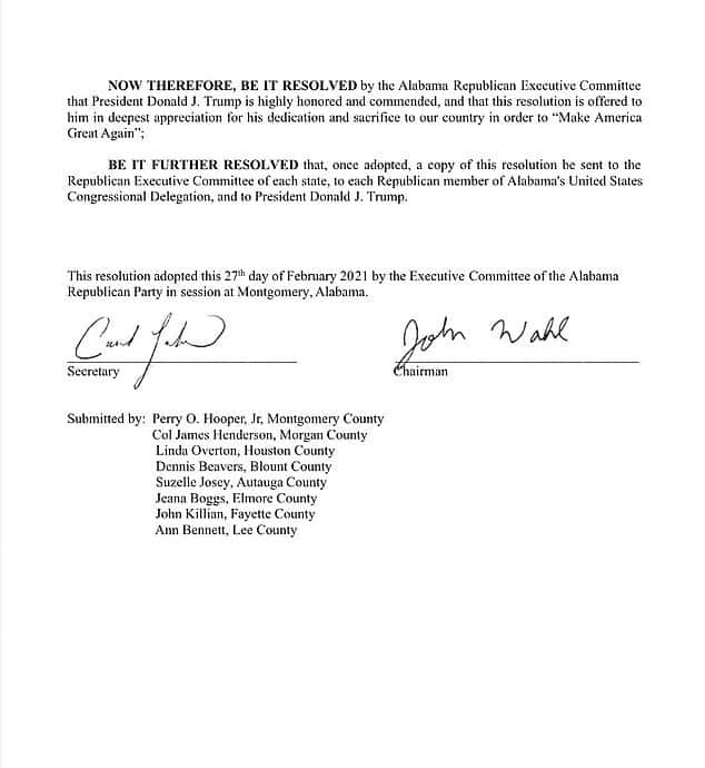 Once adopted, a copy of this resolution will be sent to the Republican Executive Committee of each state, to each Republican member of Alabama's United States Congressional Delegation, and to President Donald J Trump. The resolution was adopted on February 27, 2021.