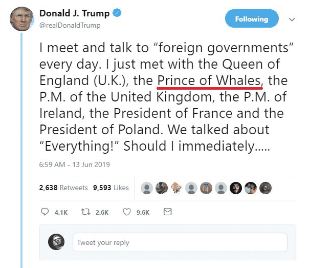 "Whale of a tweet there, Mr. President," another user wrote. A third added, "Fun fact: when I tried to type "Prince of Whales", my phone autocorrected it to Wales."