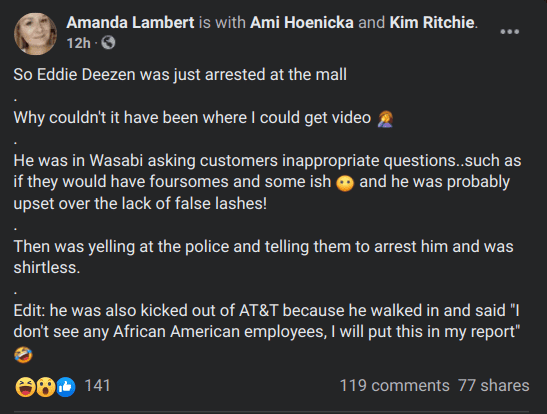 According to a Facebook post, the authenticity of which cannot be proven, Deezen allegedly asked customers at the restaurant if they would have foursomes. "So Eddie Deezen was just arrested at the mall. Why couldn't it have been where I could get video. He was in Wasabi asking customers inappropriate questions..such as if they would have foursomes and some ish and he was probably upset over the lack of false lashes! Then was yelling at the police and telling them to arrest him and was shirtless. Edit: he was also kicked out of AT&T because he walked in and said "I don't see any African American employees, I will put this in my report"