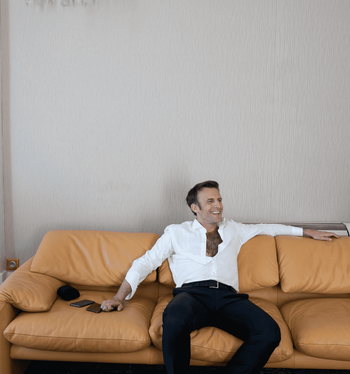 The series of images features silhouettes, some shots of Macron running on the stage and audiences. One particular image that has caught the public's eye has Macron lounging on a mustard yellow sofa. In the candid picture, Macron is wearing a whte shirt — unbuttoned to reveal his hairy chest. One of the sleeves is partially rolled up as he casually looks at the camera.