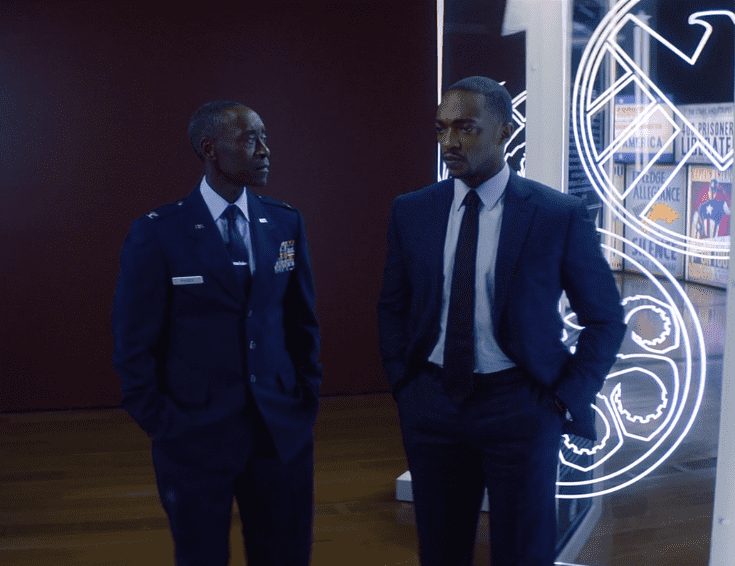 After a moving speech, Sam and James Rhodes (Don Cheadle), aka War Machine, talk to each other while walking in a museum built to honor the legacy of Captain America. Rhodes is not convinced of Sam’s decision and asks why he did not take up the mantle. Sam looks at Rhodes and says that he is not ready to be the new hero.