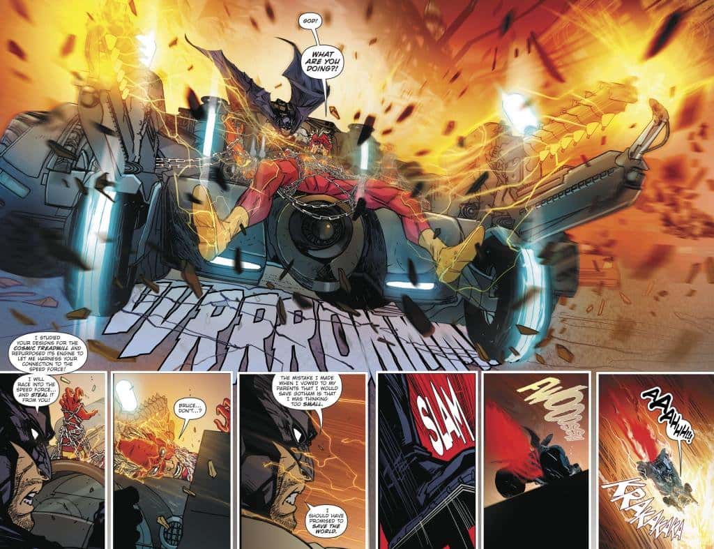 After all his Robins are killed, the Bruce Wayne of an alternate world realizes that he will never be fast enough to save everyone and truly end crime in Gotham, unless he harnesses the powers of a certain Scarlet Speedster. Subduing Barry Allen with weapons stolen from the Flash’s greatest enemies, Batman ties Barry to the hood of the Batmobile and drives into the Speed Force, effectively merging the two beings into a single, evil speedster hellbent on fighting crime by any means necessary. The newly-christened Red Death swiftly kills every single villain on the planet and the ensuing carnage shows just how much damage the Flash can do if he were to actually cut loose.