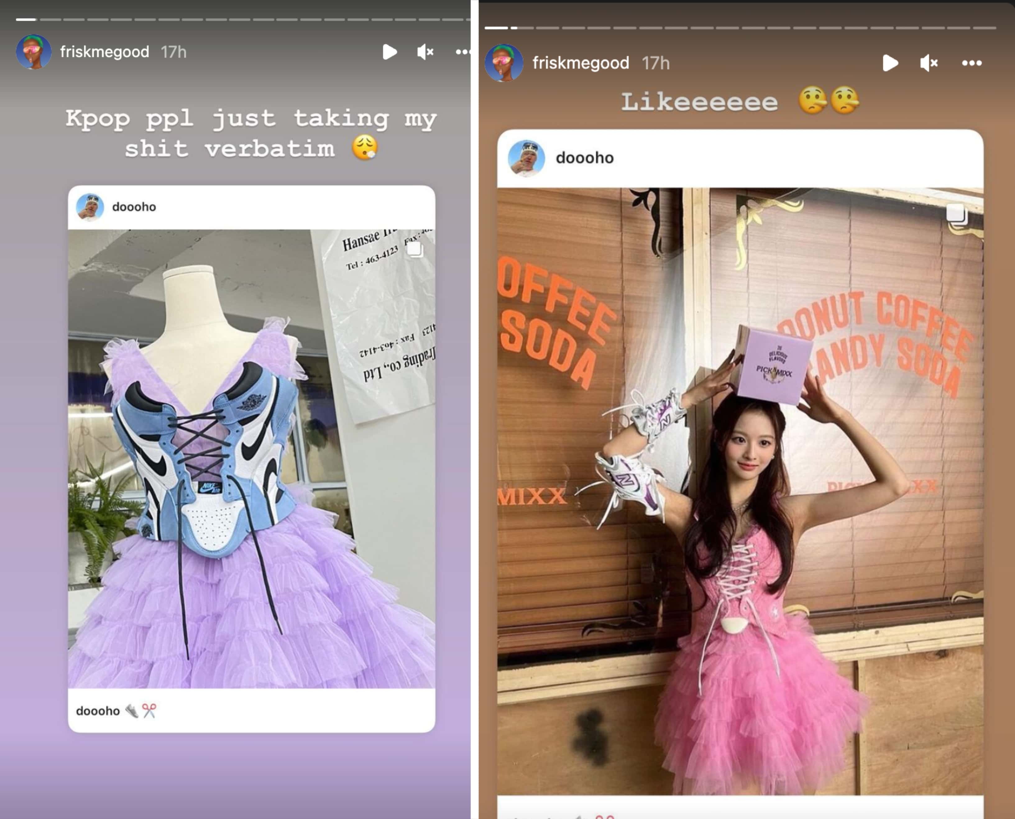 In a Twitter thread posted on their account friskmegood -- the designer -- claims that members of JYPE’s rookie group NMIXX, STAYC as well as Blackpink were all seen wearing her original designs. In their original tweet, Cierra Boyd stated that NMIXX’s stylist Ahn Dooho (user @dooho on Instagram) had stolen their original sneaker corset design that user friskmegood had first released three years ago.
