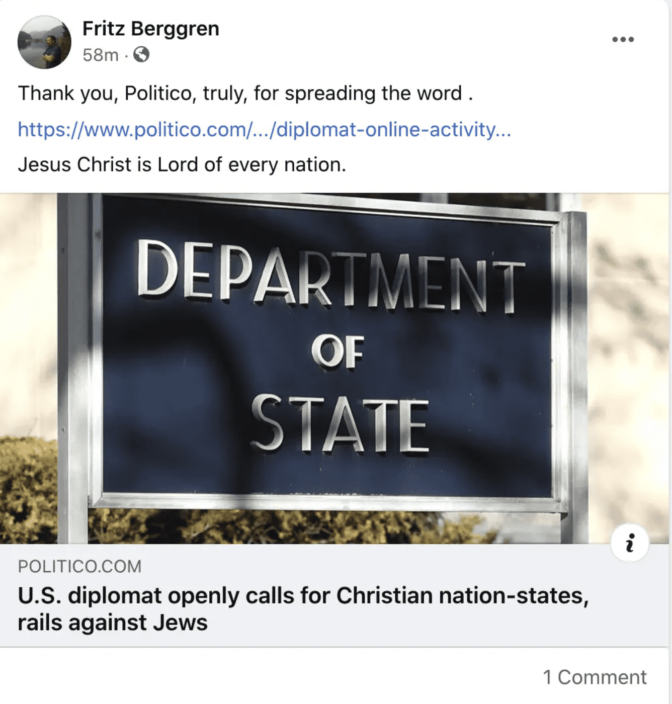 When POLITICO first published the piece on Berggren, he shared it on Facebook and said, "Thank you, politico, truly, for spreading the word. Jesus Christ is Lord of every nation." In another February 17 post, he said, "come on Whites, time to fight for our children." In July, someone drew a swastika on the wall of an elevator at the department's office. Berggren was never held as the one responsible, but the act is also mentioned in the angry letter to Blinken. "While there is no evidence that Berggren is behind the swastika... his continued employment with seemingly no consequences sends a message of impunity that has undoubtedly contributed to the atmosphere in which someone would dare to do such a thing," the letter says.