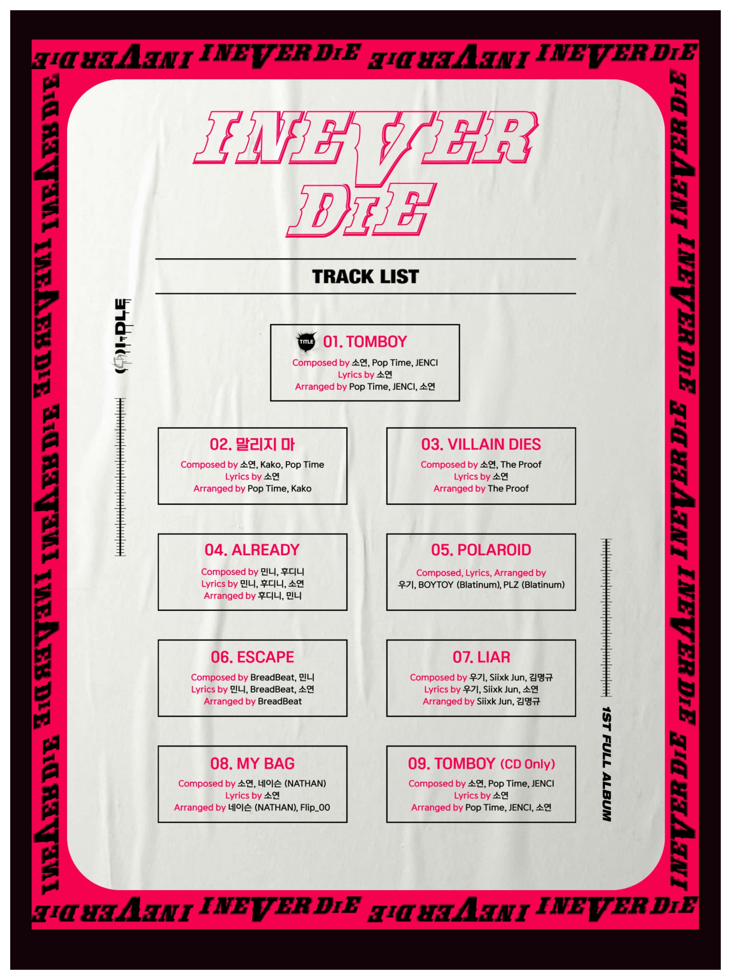 The girl group released the tracklist for the upcoming album which will release with the lead single, ‘Tomboy’. Fans who purchase the album will receive a special version of the lead single that will only be available on the CD. The album has members Yuqi, Minnie, and Soyeon working on most of the lyrics, with Soyeon working on all songs but ‘Polaroid’.