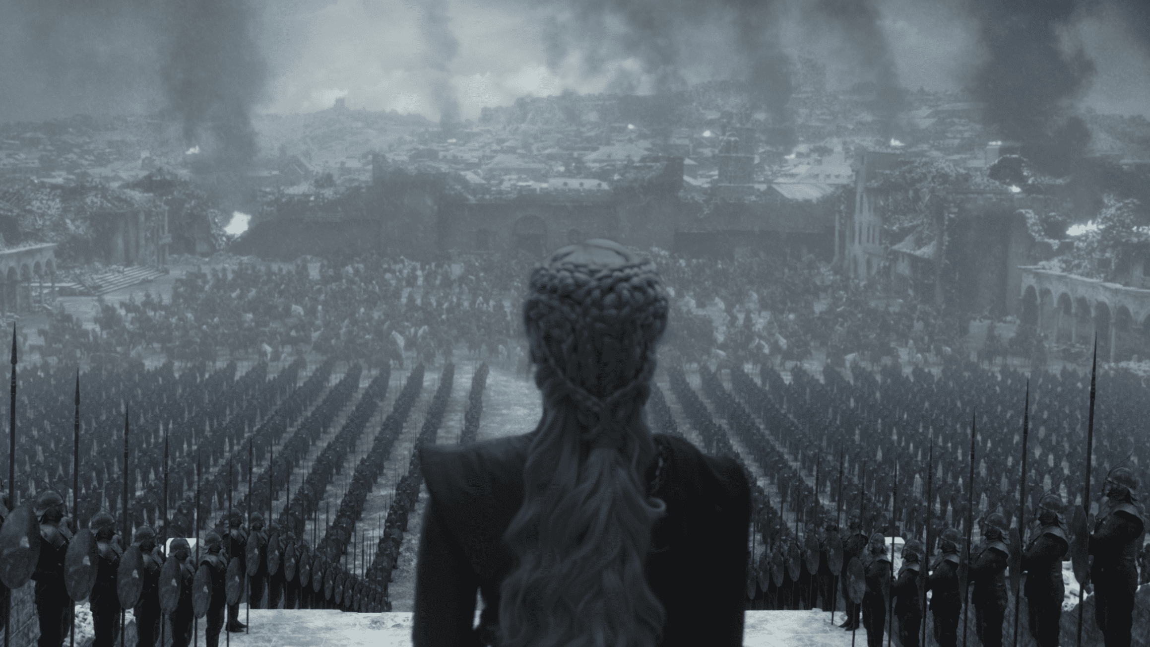 The first picture shows Daenerys standing to address the Unsullied army while King's Landing continues to burn, engulfing the capital of Westeros in a thick cloud of black smoke. The sunny city of King's Landing suddenly looks more like Winterfell, not because of the cold but because of the ashes, smolders and cement in the air. Along with the Unsullied, there's the Dothraki looking up at her.