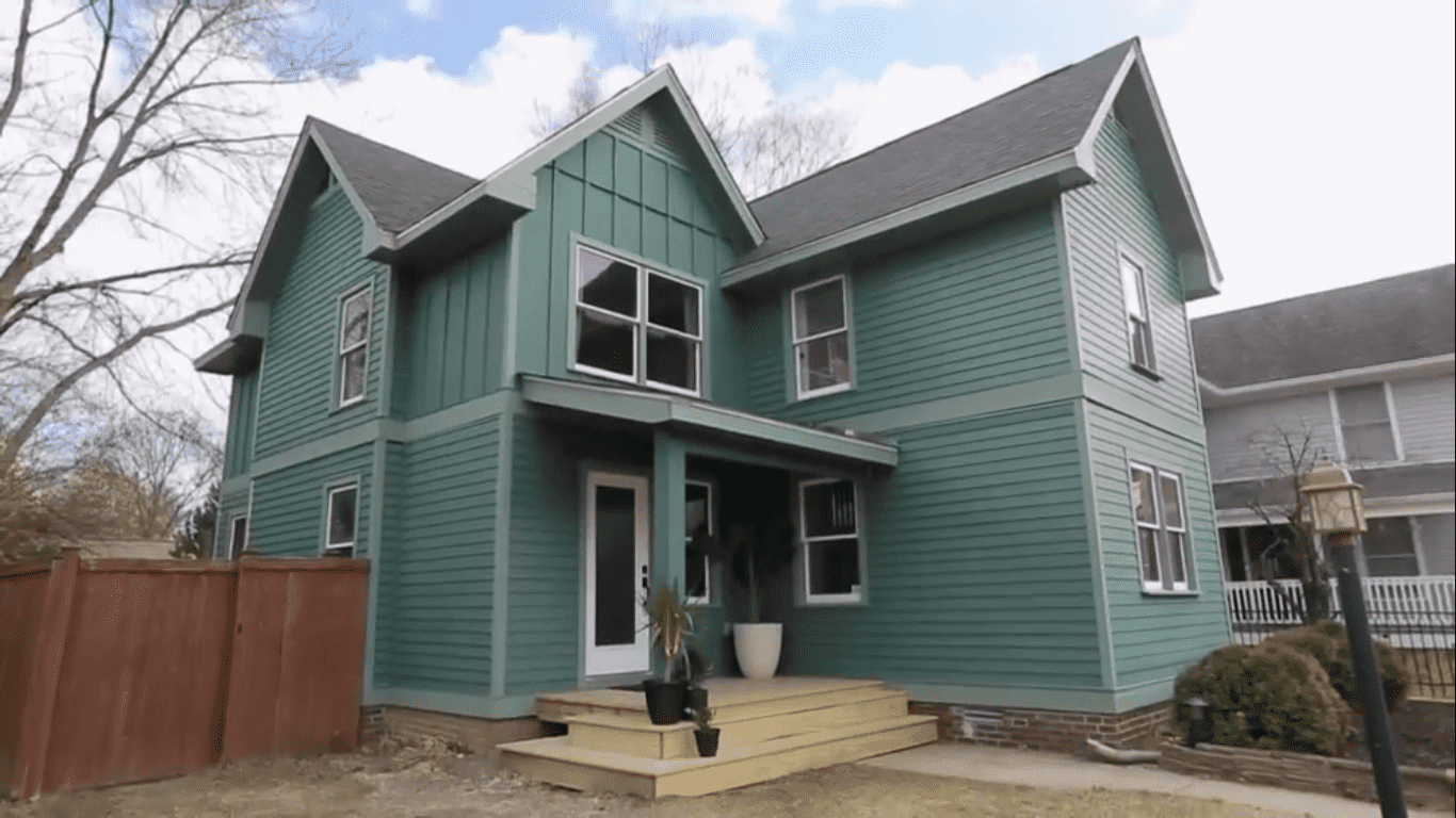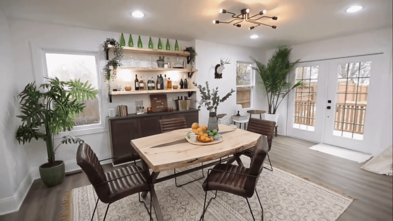 In contrast to the all-white bright shades on the exterior of the house, Mina and Karen decide to give it a dark on dark look. The facade will be painted green and complimented by dark trims, to add some appeal to the modern-urban style transformation and give it an edgy feel. Karen's DIY will focus on making a designated pet area underneath the living room staircase for Curtis and Mel's two dogs and a cat. The team is also designing a custom ambrosian maple dining table for the dining room, with live-edge open shelving for the bar. The dining room walls will also have matching maple, to support the bar-shelving. The kitchen will sport some floating steel shelving, while the living room stairwell will get a floor to ceiling metal railing.