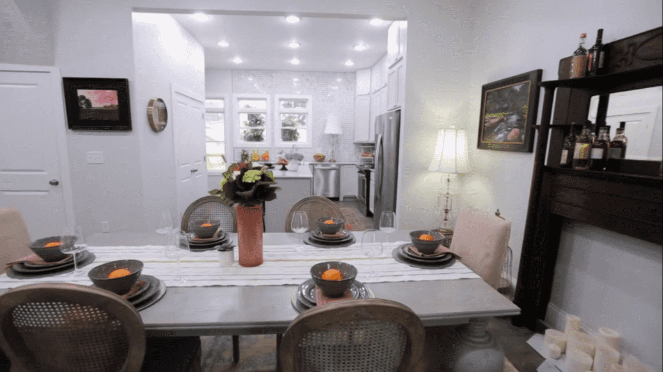 The exterior of the house gets a white-washing and a gorgeous ornate pocket door with Victorian appeal becomes Karen's DIY project. Outside, the team plants a stretch of evergreens for shade and a pop of color. Inside, the house gets cool-toned vinyl plank floors, throughout the space. In the kitchen, white marble countertops are installed making the place look clean and elegant and the house gets antique, modern and Victorian-inspired interior elements. Large hexagonal tiles go up on the master bathroom's walls. Karen also restores a Victoria looking fireplace mantle for the dining room.
