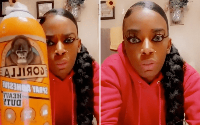 "Hey, y'all. For those of you that know me to know that my hair has been like this for about a month now. It's not by choice. No, it's not by choice. When I do my hair, I like to finish it off with a little Got2b Glued Spray, you know, just to keep it in place. Well, I didn't have any more Got2b Glued Spray, so I used this: Gorilla Glue spray. Bad, bad, bad idea," she said.