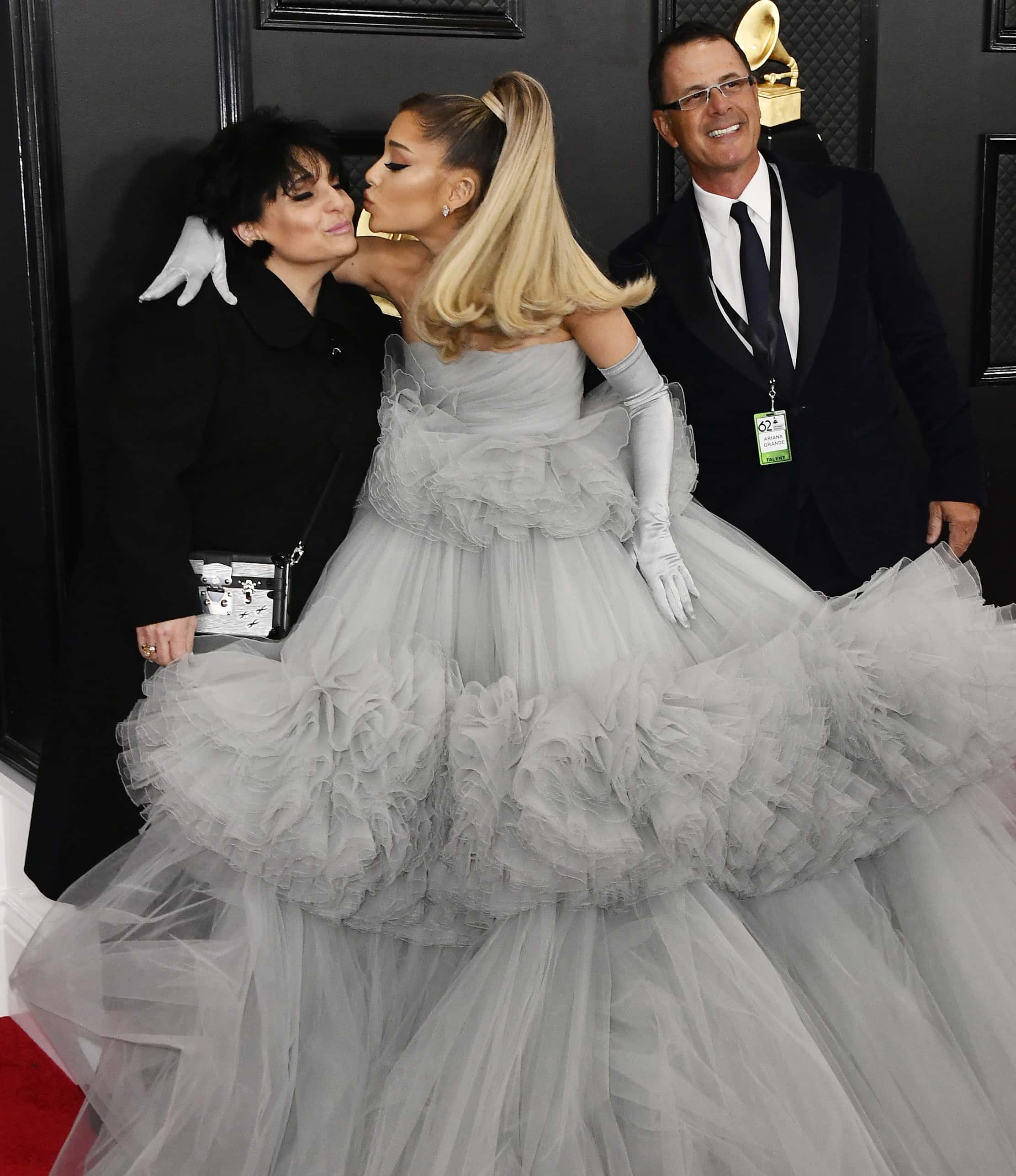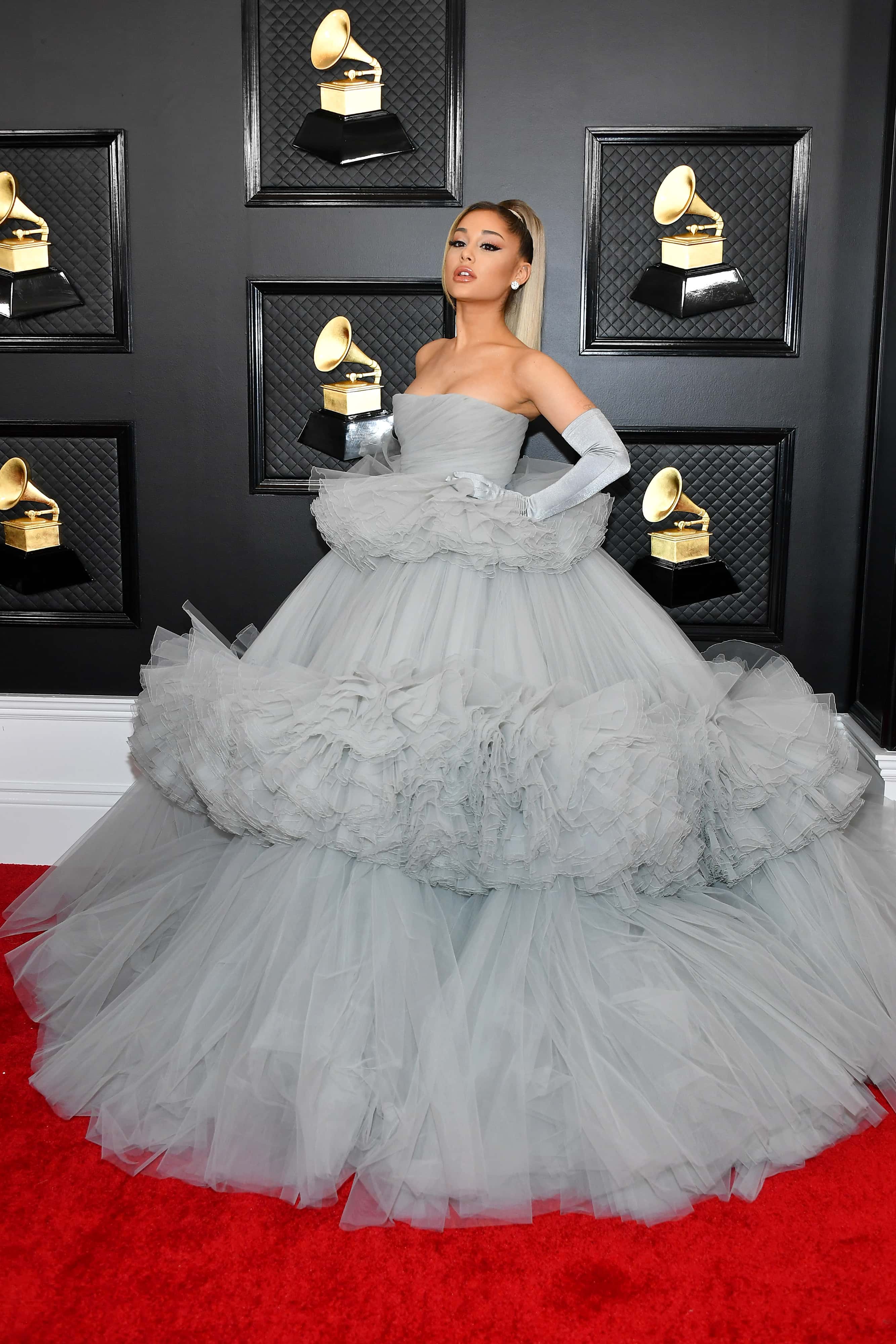 Ariana Grande walked onto the Grammys red carpet this year, in person, in the fluffiest blue-grey Giambattista Valli creation. Grande had a princess moment for sure in the tulle dress and completed the look with a pair of long silver-grey gloves and her signature ponytail, dyed blonde this year.