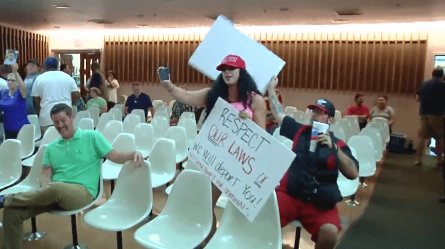 Although the protesters - one of them sporting the president's signature "Make America Great Again" hat - did not speak during the public comment period, given before the vote was held, they stood up after the vote and began shouting. While the female Trump supporter held a sign that said, “Respect our laws or we will deport you! No sanctuary for criminals” the man she is with, held another sign that said, “Stop rewarding start deporting.”