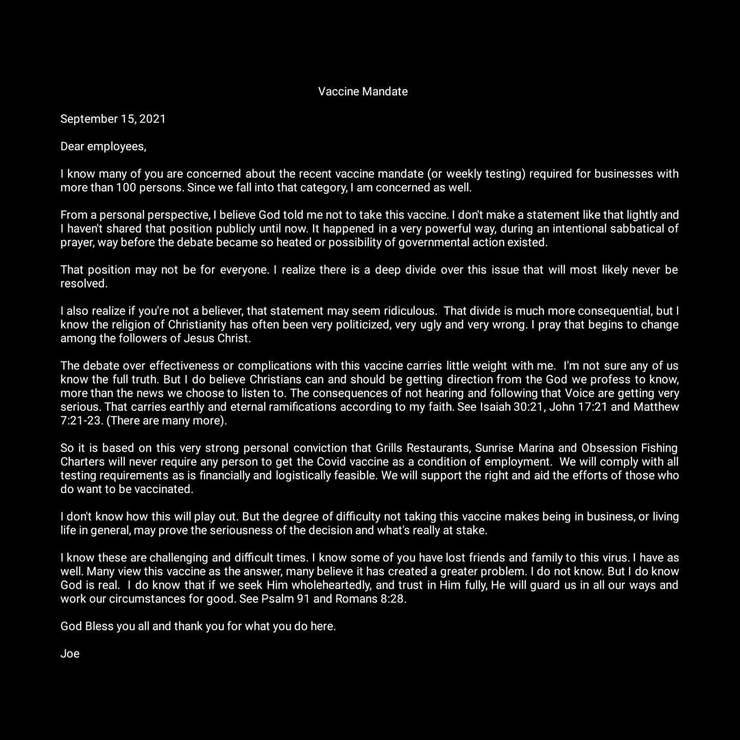 Florida now has the third-highest number of deaths from Covid-19 in the USA, but that hasn't stopped people from continued to battle vaccine mandates. As with most conservatives, a bar owner has claimed religion as an exemption to getting vaxxed, but with a twist. Joe Penovich told his employees that he wouldn't be complying with the federal vaccine mandate for businesses, because "God told me not to take this vaccine."