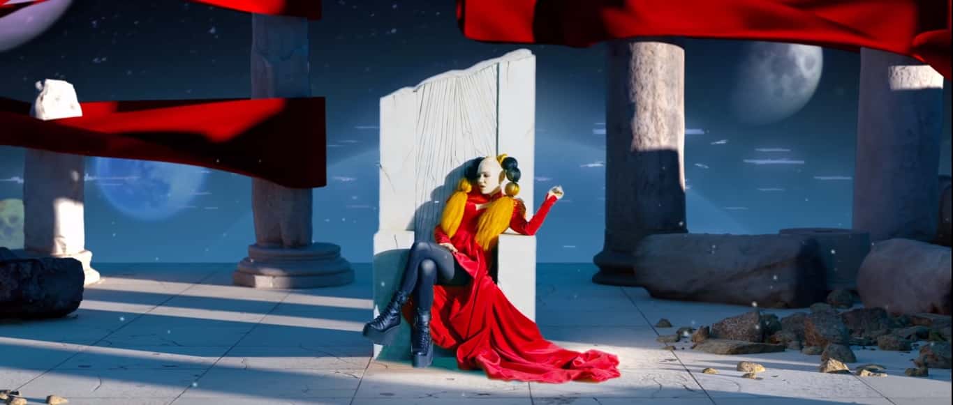 Grimes shows off her love for anime as she sits like a sci-fi queen in space on a throne very similar to Akira's throne found in the 'Akira' comics.