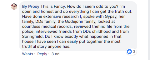 Some even suggested that not all was right when they began to doubt how Fancy even knew what was the truth. In answer to all questions about her credibility. Fancy wrote, “This Is Fancy. How do I seem odd to you? I'm open and honest and do everything I can to get the truth out. Have done extensive research I, spoke with Gypsy, her family, DDs family, the Godejohn family, looked at countless medical records, reviewed the find file from the police, interviewed friends from DDs childhood and from Springfield. Do I know exactly what happened in that house I have seen I can easily put together the most truthful story anyone has.”