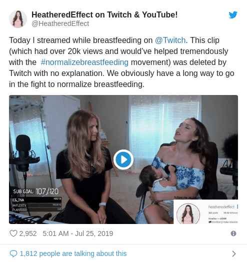 As random people started accusing her of "using her baby as an excuse" to expose her breast and "gain sexual attention," Twitch removed the clip along with other parts of the original live stream, with no explanation as to why they were doing so.