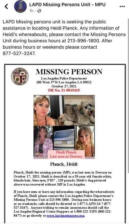 Police in Los Angeles are on the lookout for Heidi Planck, a 39-year-old mom who has been missing since October 17. That was the last time anyone heard or saw Planck, who had left her son's football game at halftime, reportedly looking "edgy". Planck's ex-husband Jim Wayne was only made aware she was missing three days later after she failed to pick up the couple's 10-year-old son from school.