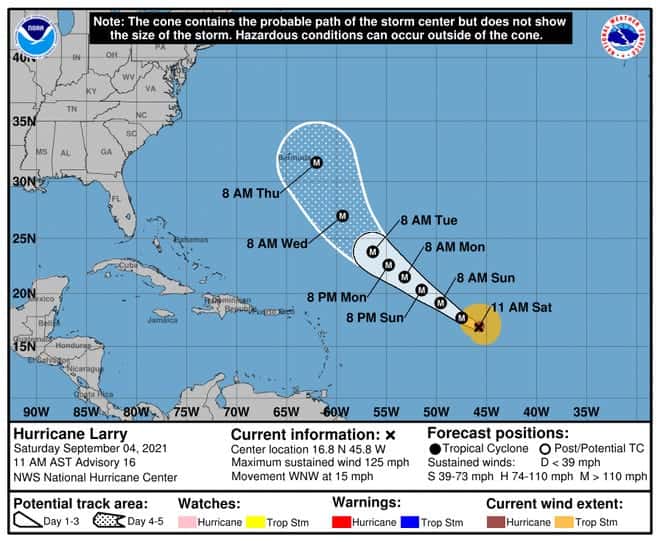 On Sunday afternoon, Larry was located about 830 miles east of the Northern Leeward Islands. it was moving to the northwest with the maximum sustained winds at 125 mph, with higher gusts, the National Hurricane Center said. "Little change in strength is forecast during the next few days, although fluctuations in intensity will be possible. Larry is expected to remain a major hurricane through the middle of this week," the center said.