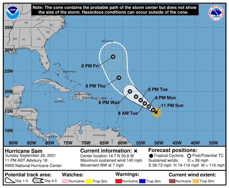 The good news is though, that Sam may not come anywhere close to the US. The National Hurricane Centre expects Sam to continue on its path North West, before turning northwards towards Bermuda. Predictions show that by Friday, October 1, the eye of the storm will be over the island nation, well away from the US mainland. As a result, the center issued a public advisory on September 26 saying, "There are no coastal watches or warnings in effect."