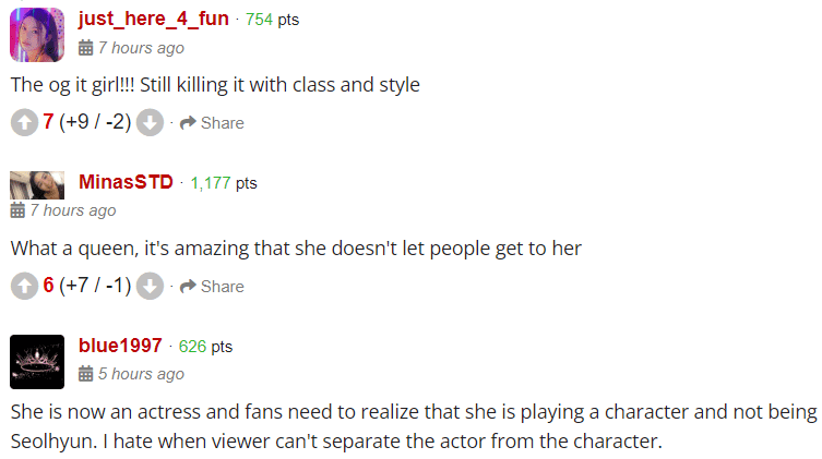 One flexed, “This is smooth as f**k, lol.” One fan commented, “She wasn't supposed to be pretty. She is supposed to be in character, and if you can't distinguish the usual idol-pretty-red carpet ready Seolhyun from Do AhHee then she's doing a good job.” Another joked, “She really said ‘aww...anyway’.” One said, “I'm horrified that she was reading those nasty comments but got to admit her pr strategy is great lol.”