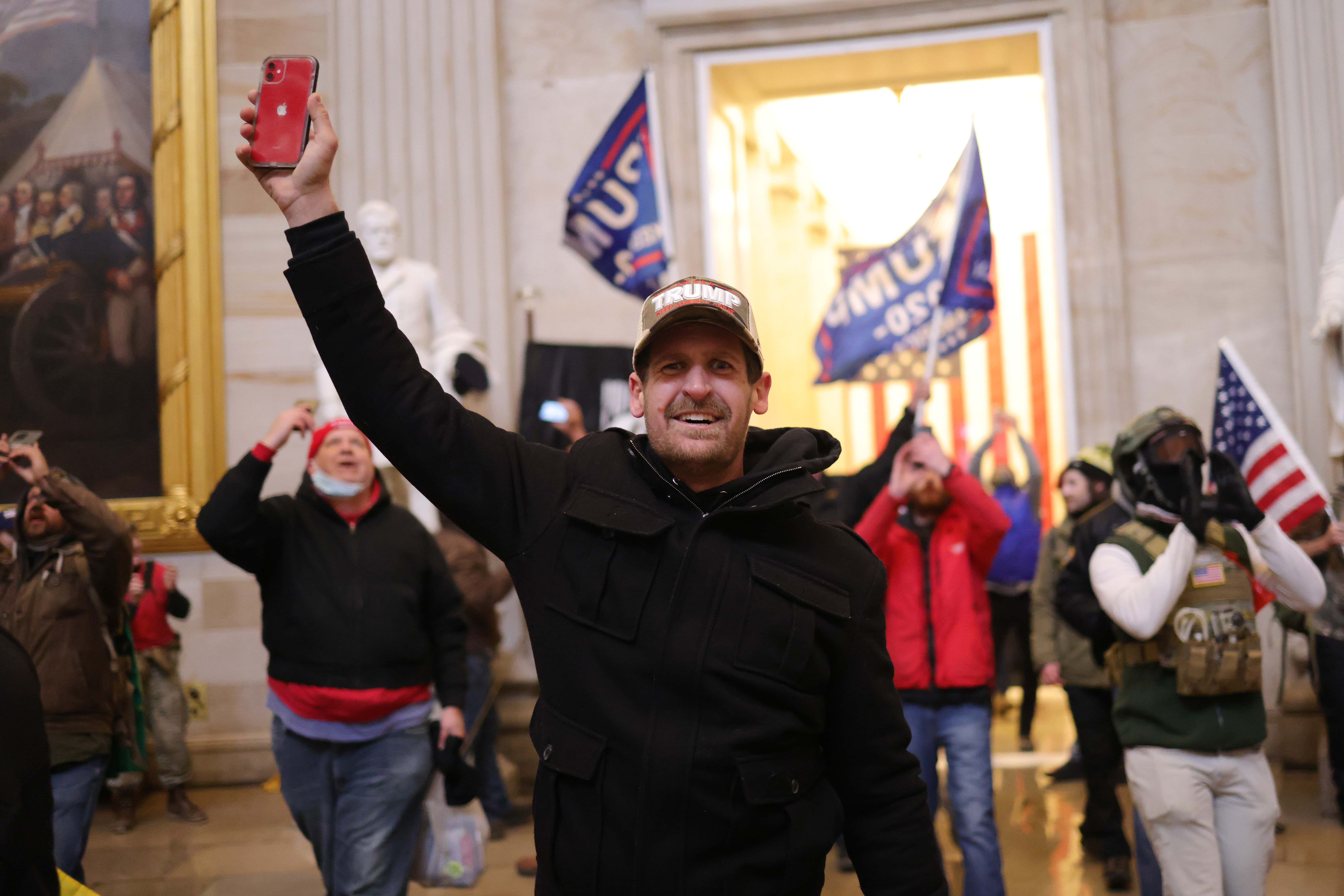 In the viral video, he can be heard saying, “We’re all part of this (expletive) history” as they enter the rotunda around 15 minutes in, and he says to his companion, “2021! (expletive) This is insanity. I am shook. What is this? What is this painting, you know? King (expletive) bro (expletive)!” He can be heard exchanging social media information with another man, and then he and the filmmaker talk about what they’re witnessing. “Is this not going to be the best film you’ve ever made in your life?” he says. “Dude, I was trying to tell you. I couldn’t say much.”