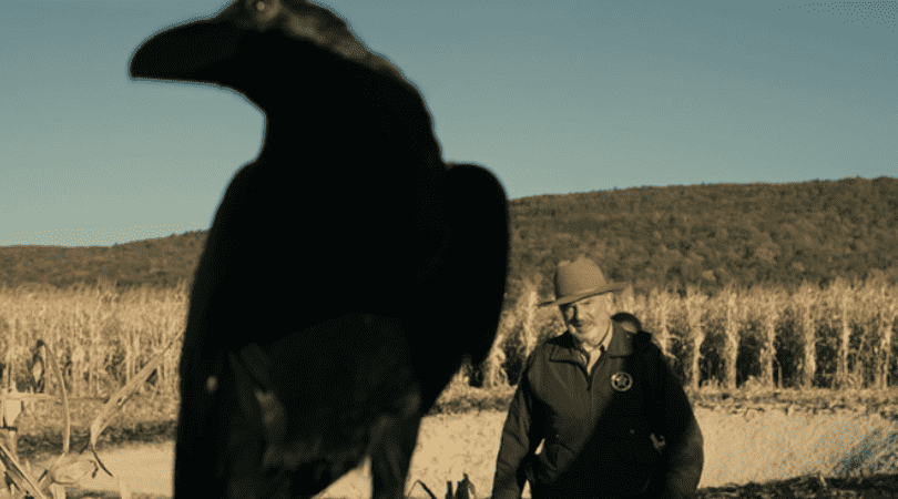 The show opens in the Arabian Desert in Yemen on Earth where a shepherd lays with his camels. Suddenly a loud boom is heard in the distance as the camels sensing danger run away. The man looks on as he sees the sand rise and come towards him as if something is tunneling underneath. In a split second, he's blasted off behind. The next scene takes us to Idabel, Oklahoma, USA where John Bell Tyson (Sam Neill) is getting dressed for his last day as Sheriff before he retires. Kissing his wife goodbye, he goes to the station where a case about a stolen truck and missing suspects come in. He goes to investigate where he finds something strange in the cornfield with crows circling over a spot.