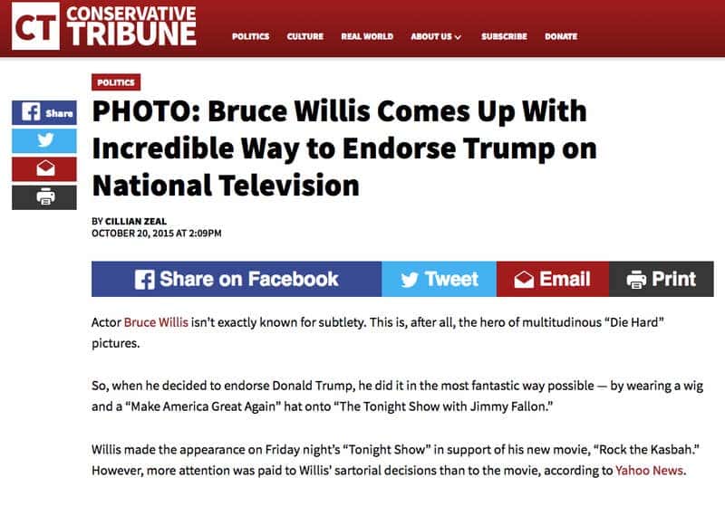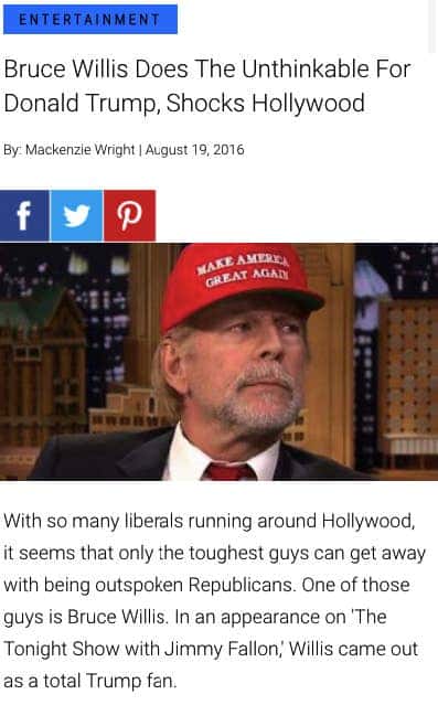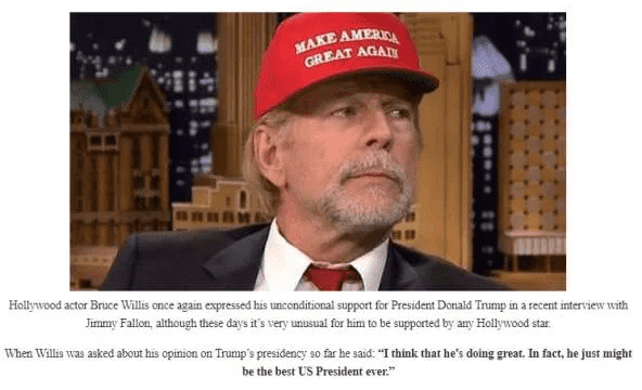 According to Snopes, a fact-checking website, many of the outlets created fake pro-Trump quotes to attribute to the actor in an effort to promote Trump's campaign. These articles were shared widely. The fact-checking website further said, that one variant of this falsehood began spreading in November 2017, when various sites published versions of the hoax centering on Willis. At least two of these sites, USA Updated Daily News and World Wide Politics, even replicated the same centered text layout and a picture of Willis wearing a Trump wig and a red “Make America Great Again” baseball cap, which he wore when he visited the Jimmy Fallon show.
