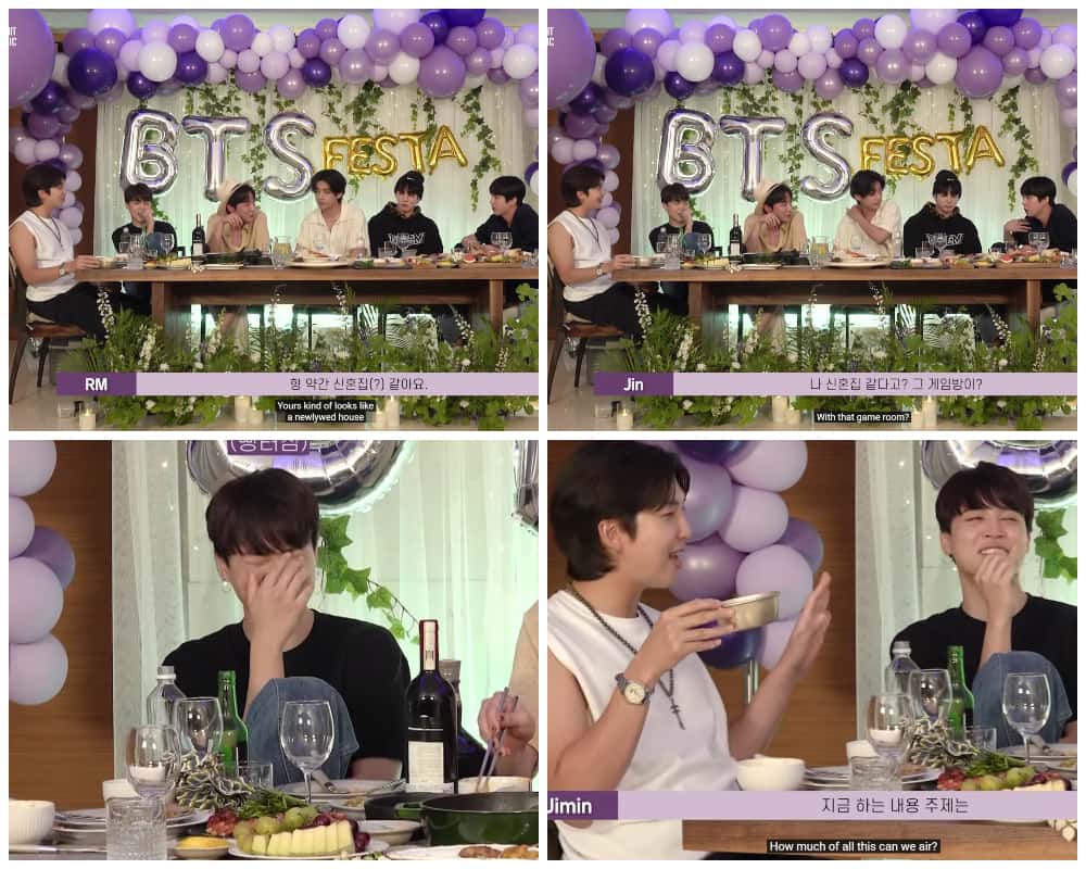 jimin laughing at joon saying jin's house looks like a newlywed's house, and saying "how much of this can we air" .... SOMEONE IS DEFINITELY MARRIED 😌