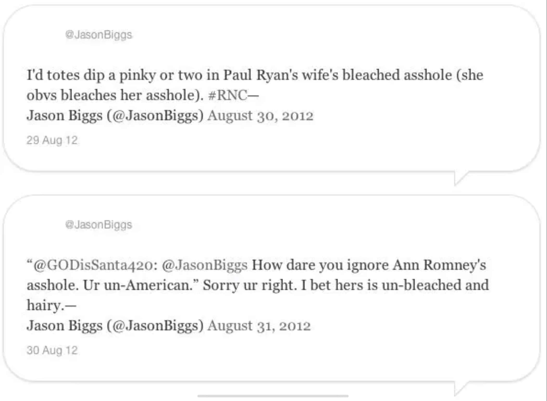 The messages below convey that he had a lot to say about Ann Romney, Mitt Romney's wife and Janna Ryan, Paul Ryan's wife during the 2012 Republic National Convention.