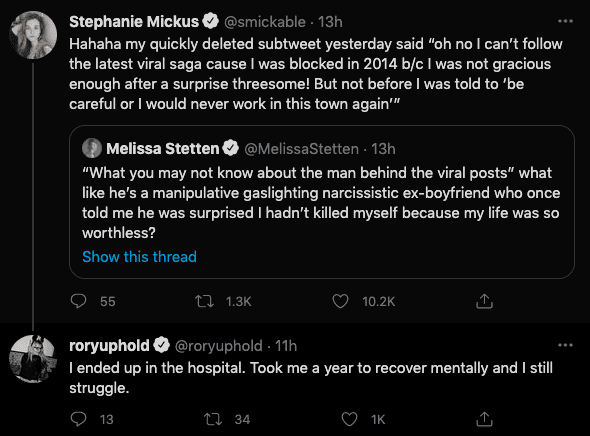 Disturbingly enough, writer Rory Uphold responded to Mickus, writing, "I ended up in the hospital. Took me a year to recover mentally and I still struggle." Earlier, she had retweeted an LA article writing, "That this is the most abusive person I have ever been with and I am crying as I type this." But there are allegedly more women who have stories related to Karp, as Mickus tweeted, "The amount of women who DM’d me with stories today. Let alone the ones I have known about for years and talked to about our shared experiences. Oh lord."