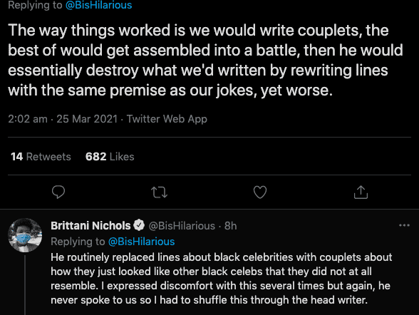 She further added, "The way things worked is we would write couplets, the best of would get assembled into a battle, then he would essentially destroy what we'd written by rewriting lines with the same premise as our jokes, yet worse. He routinely replaced lines about black celebrities with couplets about how they just looked like other black celebs that they did not at all resemble. I expressed discomfort with this several times but again, he never spoke to us so I had to shuffle this through the head writer."