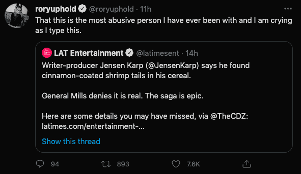 Wait...how did we go from making fun of shrimp being in Cinnamon Toast Crunch to now attacking Jensen Karp and saying that he did it on purpose, lying and/or he’s an abusive gaslighter? I missed several steps here....