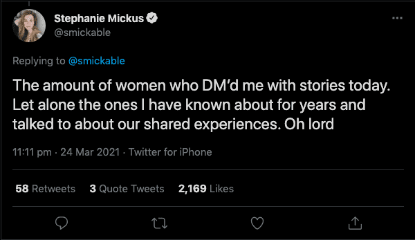 The amount of women who DM’d me with stories today. Let alone the ones I have known about for years and talked to about our shared experiences. Oh lord