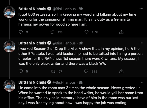 Furthermore, comic Brittani Nichols tweeted about her experience with Karp while working on Season 2 of the celebrity rap-battle series 'Drop the Mic' with a long thread on Twitter. In part, it read, "I worked Season 2 of Drop the Mic. A show that, in my opinion, he & the other EPs stole. I was told leadership had to be talked into hiring a person of color for the RAP show. 1st season there were 0 writers. My season, I was the only black writer and there was a black WA," she said.