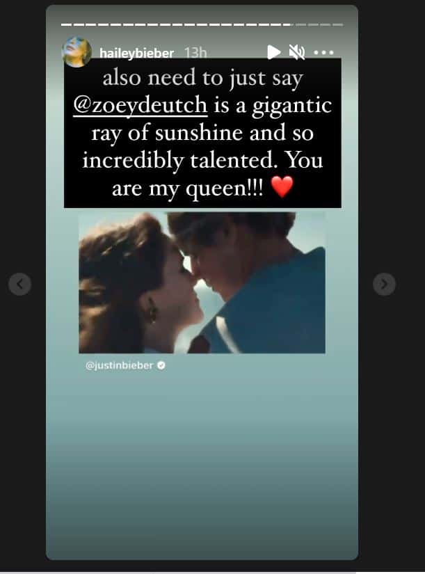 If you thought Hailey Bieber was jealous of the fictional love story, you couldn't be more wrong. "Also need to just say @zoeydeutch is a gigantic ray of sunshine and so incredibly talented. You are my queen!!!" she wrote in her Instagram stories featuring screen grabs of the fictional couple.