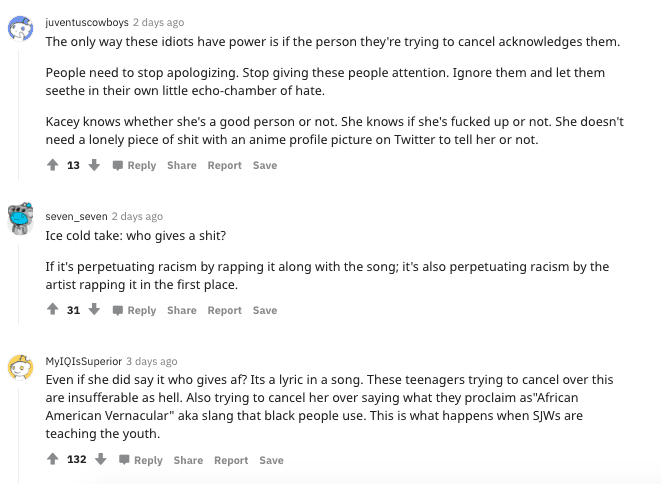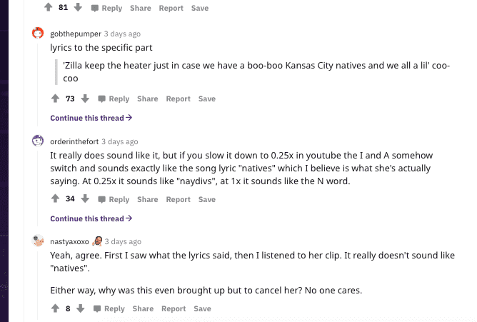 Some of her fans also advised her to be quiet about the situation and let it go, with one user writing, "I listened to it & even if u did say it, u could barely hear it. To me it sounds like someone is just tryin to find the smallest shit to try & cancel u. I'm not sure what brought up this 5 month old vod but I wouldn't give them the attention they so desperately crave." Another added, "I think it sounds like you said "niggas" and the lyrics is "natives", but who gives a shit what I think? People getting this upset is just sad. F*ck this cancel culture bullshit." Yet another added, "I dont think that shes racist im one of the persons defending her. The problem with those toxic stans is that they take stuff out of context and to serious. They dont care if she offended the whole black community or just said it by mistake to noone. They only care about the word."
