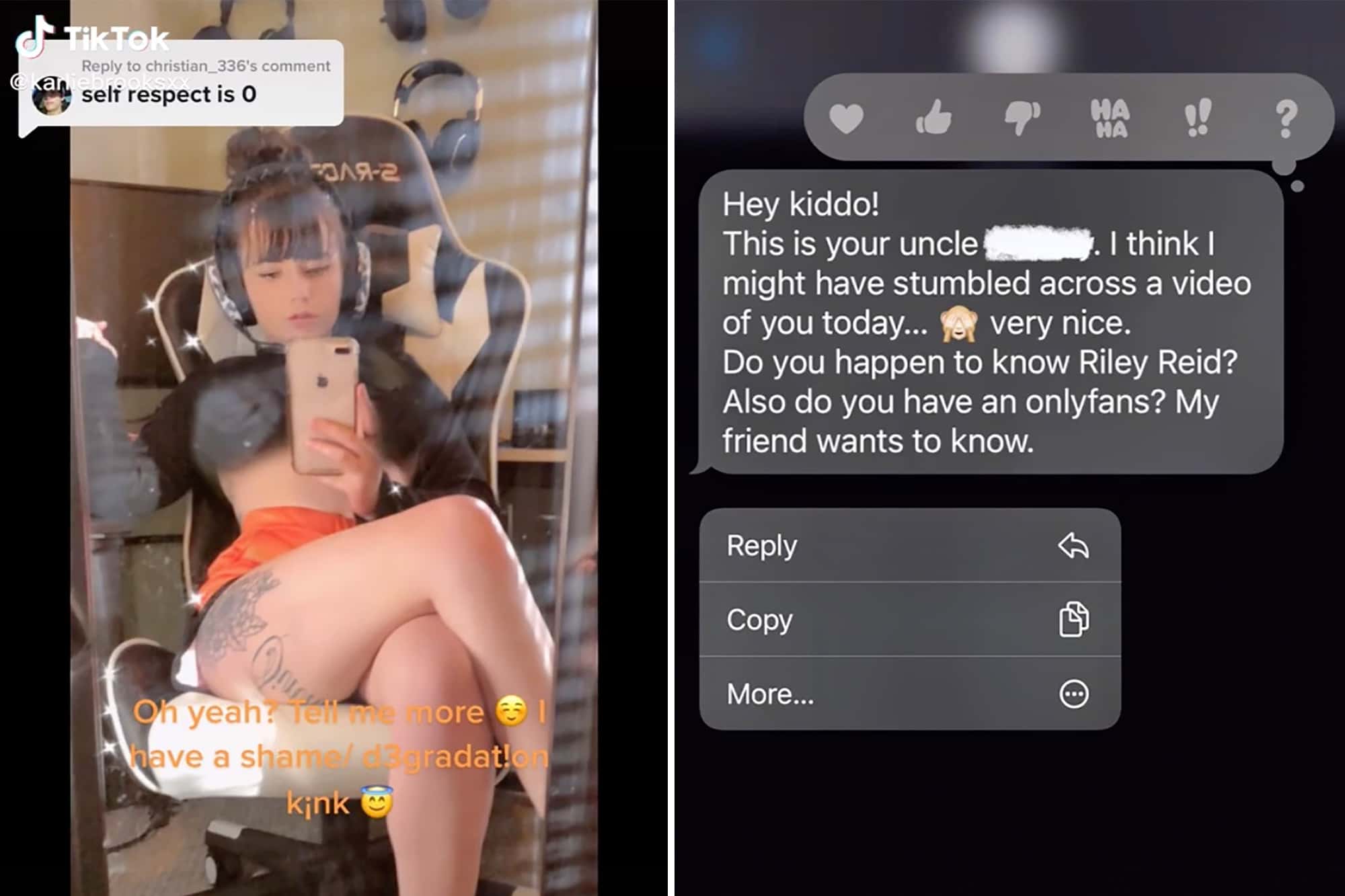 In the text message, her uncle asked her if she knew Riley Reid — a famous porn star. He then went on to ask his niece whether she had an OnlyFans profile, because a friend of his apparently wanted to know. “Hey kiddo! This is your uncle. I think I might have stumbled across a video of you today…very nice," the uncle wrote. "Do you happen to know Riley Reid? Also, do you have an OnlyFans? My friend wants to know.” The message, Brooks said, made her cringe. However, she did not confirm whether or not she responded to the text.
