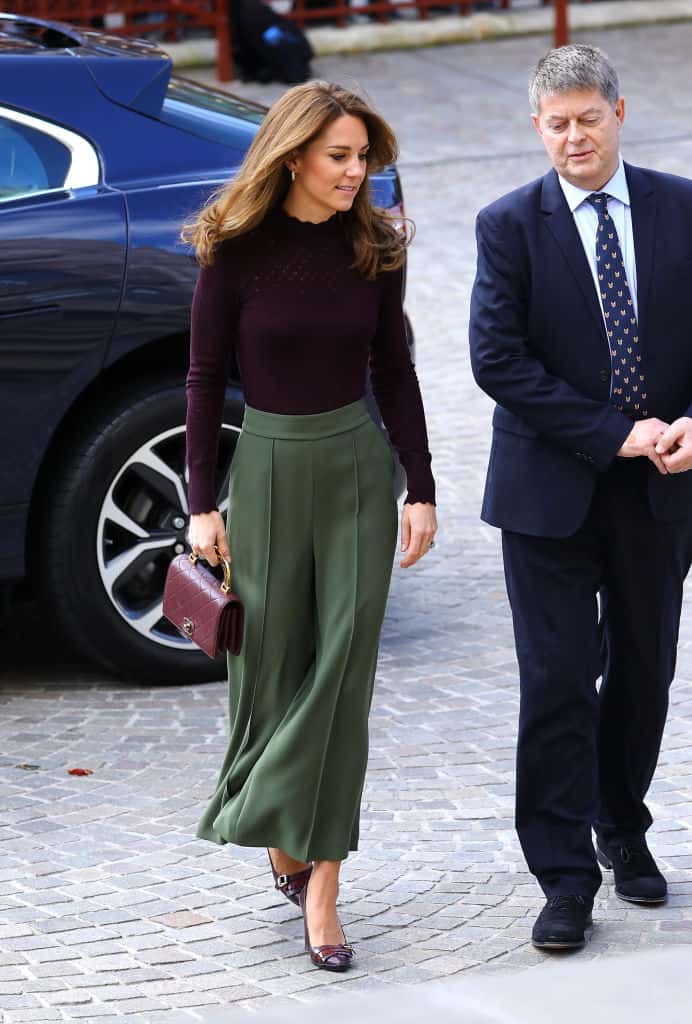 For the occasion, the 37-year-old mother-of-three wore a $48 berry-colored turtleneck from Warehouse, which featured scallop-like patterns around the neckline and sleeves. She paired her outfit with a $159 khaki culottes from the high-street brand Jigsaw.