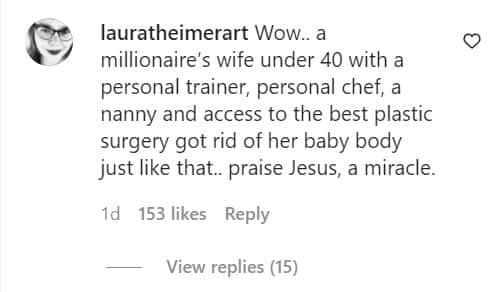 While one user commented, "Wow.. a millionaire’s wife under 40 with a personal trainer, personal chef, a nanny and access to the best plastic surgery got rid of her baby body just like that.. praise Jesus, a miracle.", another said, “Things we hear when we have babies with boomers”.