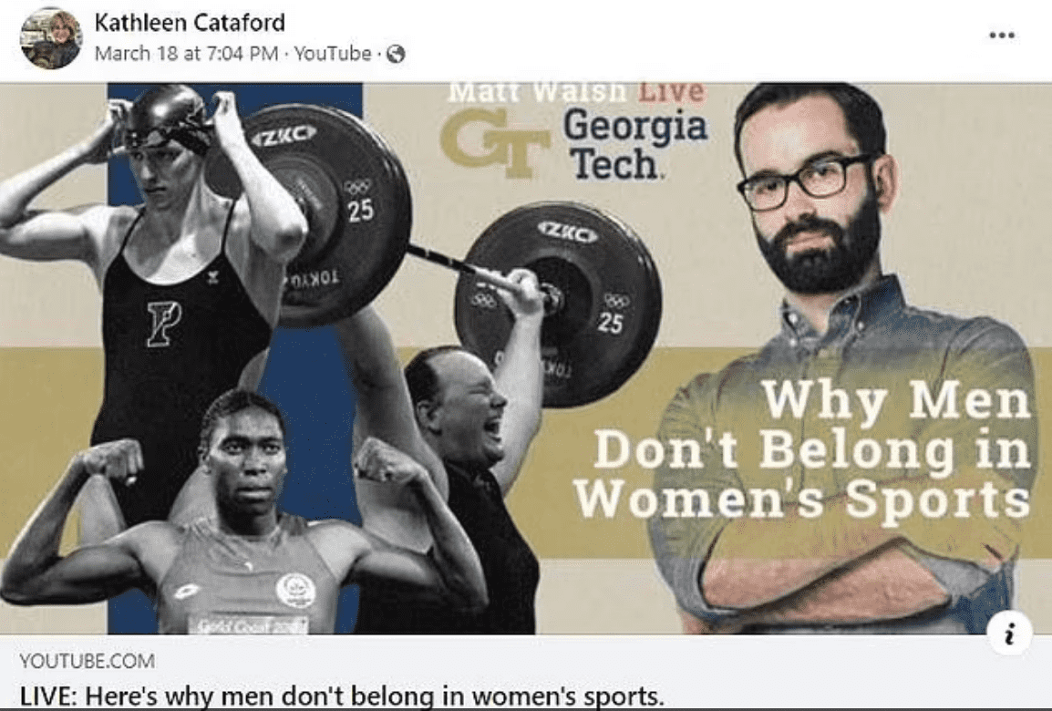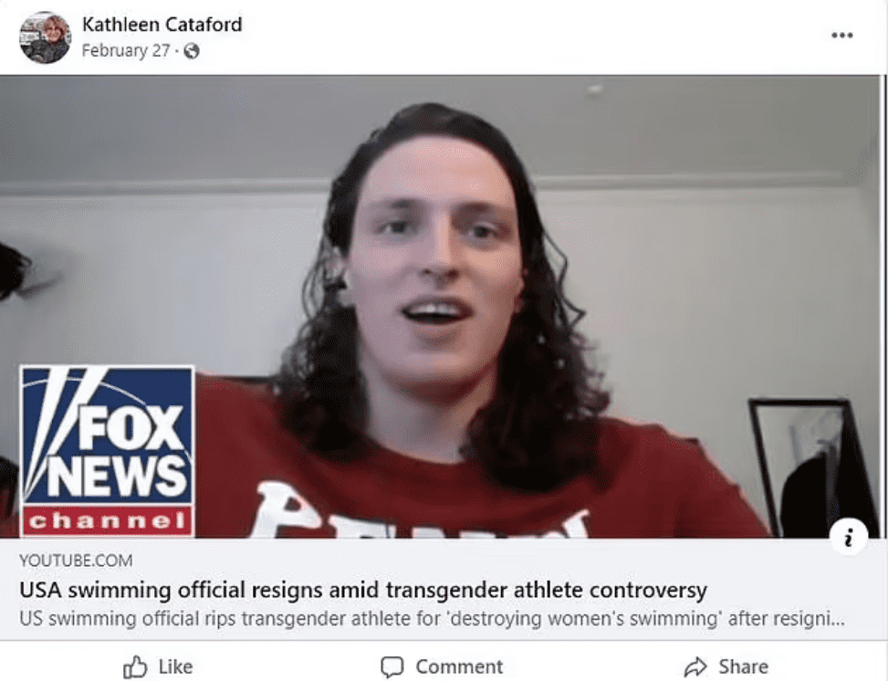 Cataford has also posted other links to stories addressing the current transgender debate on her Facebook feed. She had shared a FOX article about former USA swimming official Cynthia Millen, who had resigned to protest Pennsylvania transgender swimmer Lia Thomas' participation at Penn in the women's swimming team. Cataford also recently shared a press conference of Daily Wire commentator Matt Walsh, which was titled "Here's why men don't belong in women's sports". She expressed her support for the trucker's convoy protesting vaccine mandates, claiming that she believes in personal freedoms even though she supported vaccination.