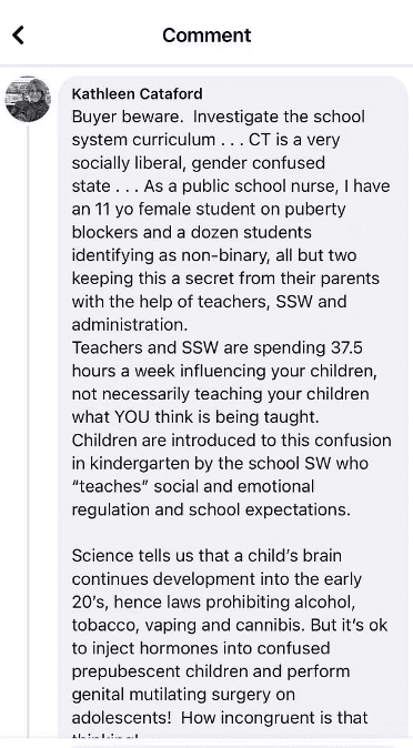 "Investigate the school system curriculum...CT is a very socially liberal, gender confused state," Cataford, 77, wrote on a local mom's group where there were requests for local school recommendations. "As a public school nurse, I have an 11yo female student on puberty blockers and a dozen identifying as non-binary, all but two keeping this as a secret from their parents with the help of teachers, SSW [social workers] and school administration. Teachers and SSW are spending 37.5 hours a week influencing our children, not necessarily teaching our children what YOU think is being taught."