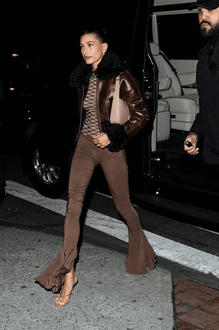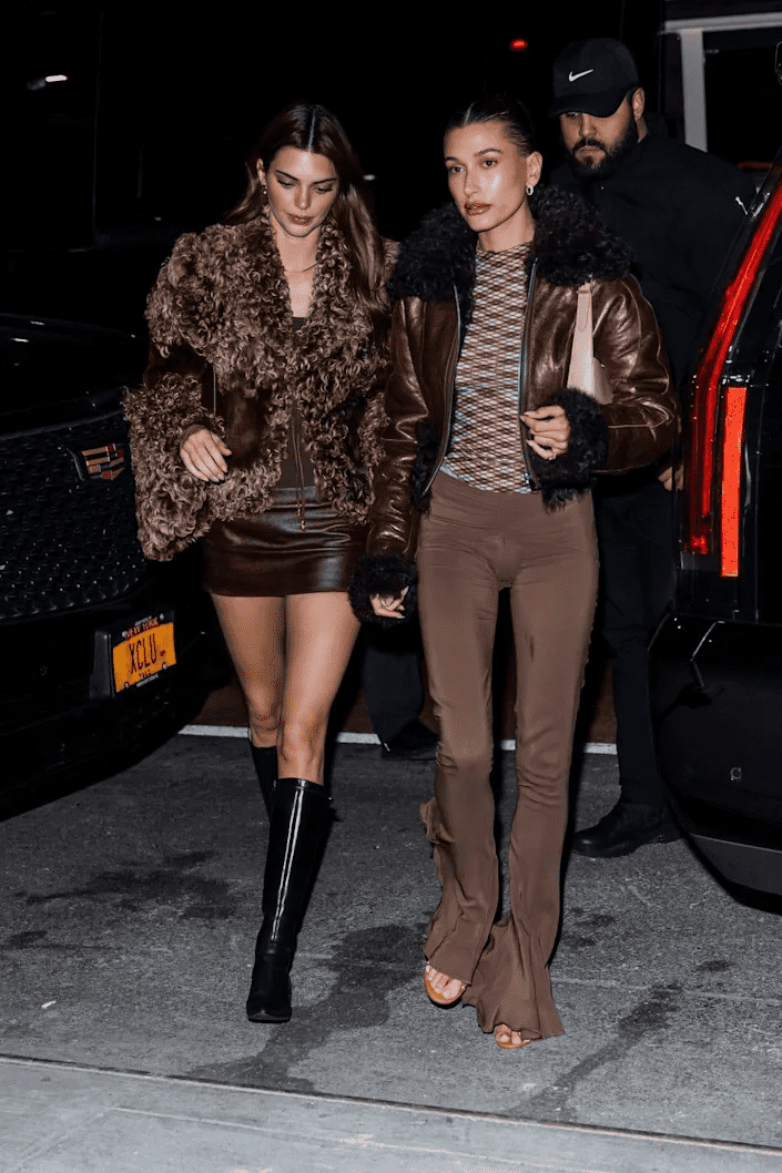 Meanwhile, Kendall’s partner for the Saturday night's outing, Hailey Bieber, wore a short leather jacket in almost the exact shade as Jenner's skirt, with fur cuffs, over a pair of tight slacks with a ruched waist and bell bottoms opening up over her strappy, high-heeled sandals. She wore a sheer, grid-patterned shirt underneath the jacket and accessorized with gold earrings and a little white purse with a short strap.