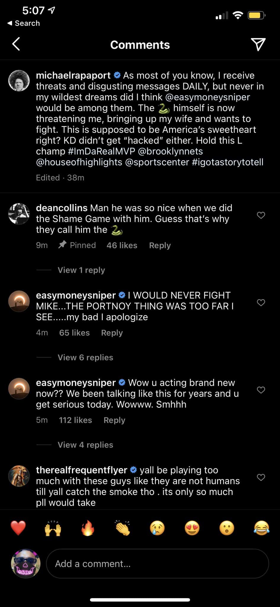Durant went on to ask for Rapaport’s address and challenge him to a fistfight on the streets of New York. “Your wife doesn’t even respect your b***h a**,” Durant wrote. “I receive threats and disgusting messages DAILY, but never in my wildest dreams did I think @KDTrey5 would be among them,” Rapaport wrote on Tuesday afternoon. “The (snake emoji) himself is now threatening me, bringing up my wife and wants to fight. This is supposed to be America’s sweetheart right? #ImDaRealMVP."