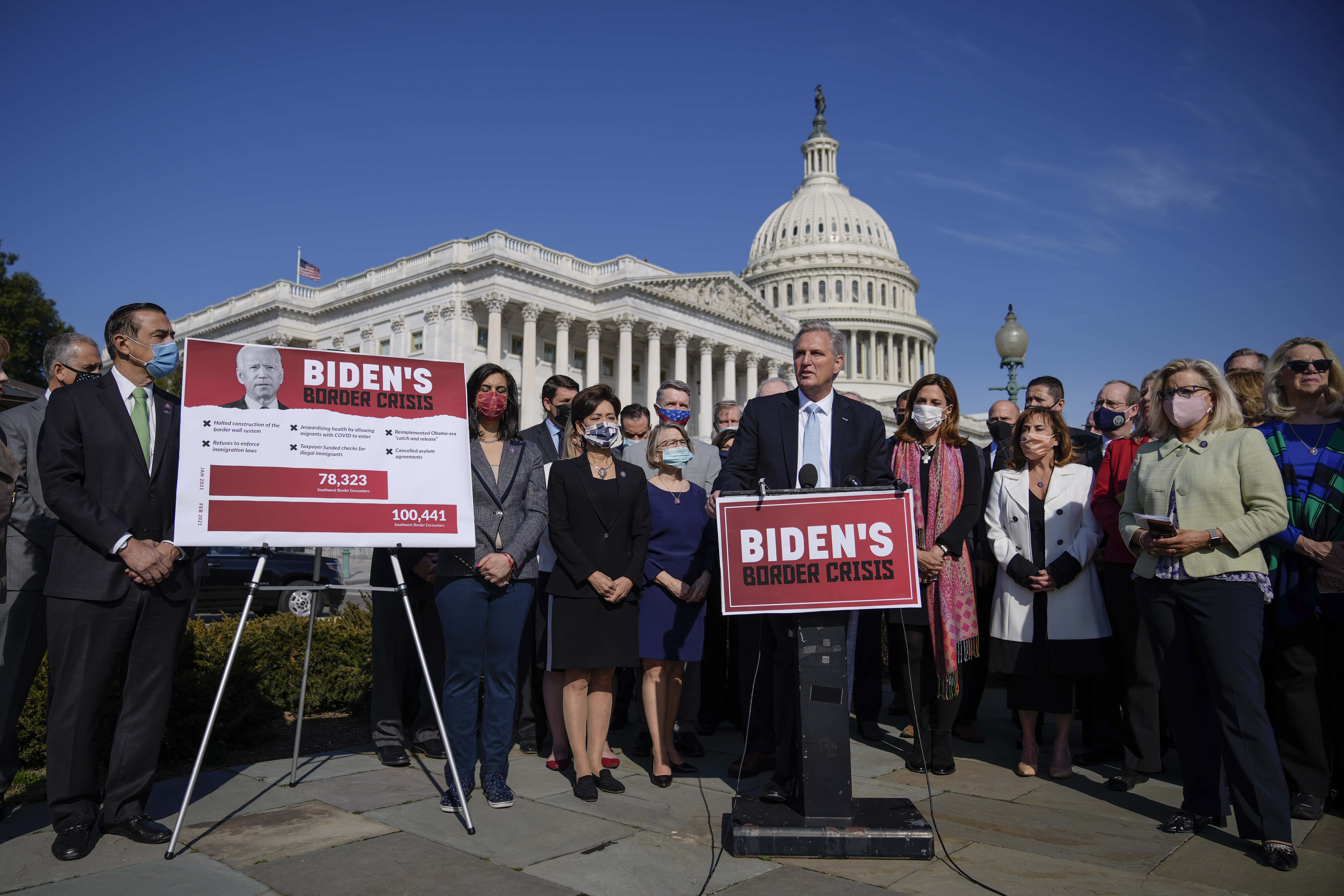 A group of Republican House members toured a migrant processing center and met with border officials during a visit to El Paso, Texas, on Monday, March 15. McCarthy led the Congressional delegation to discuss what he called "President Biden's border crisis". Katko claimed that border agents had apprehended people on the terrorist watchlist in recent days, blaming Biden for rolling back former President Donald Trump's immigration policies.