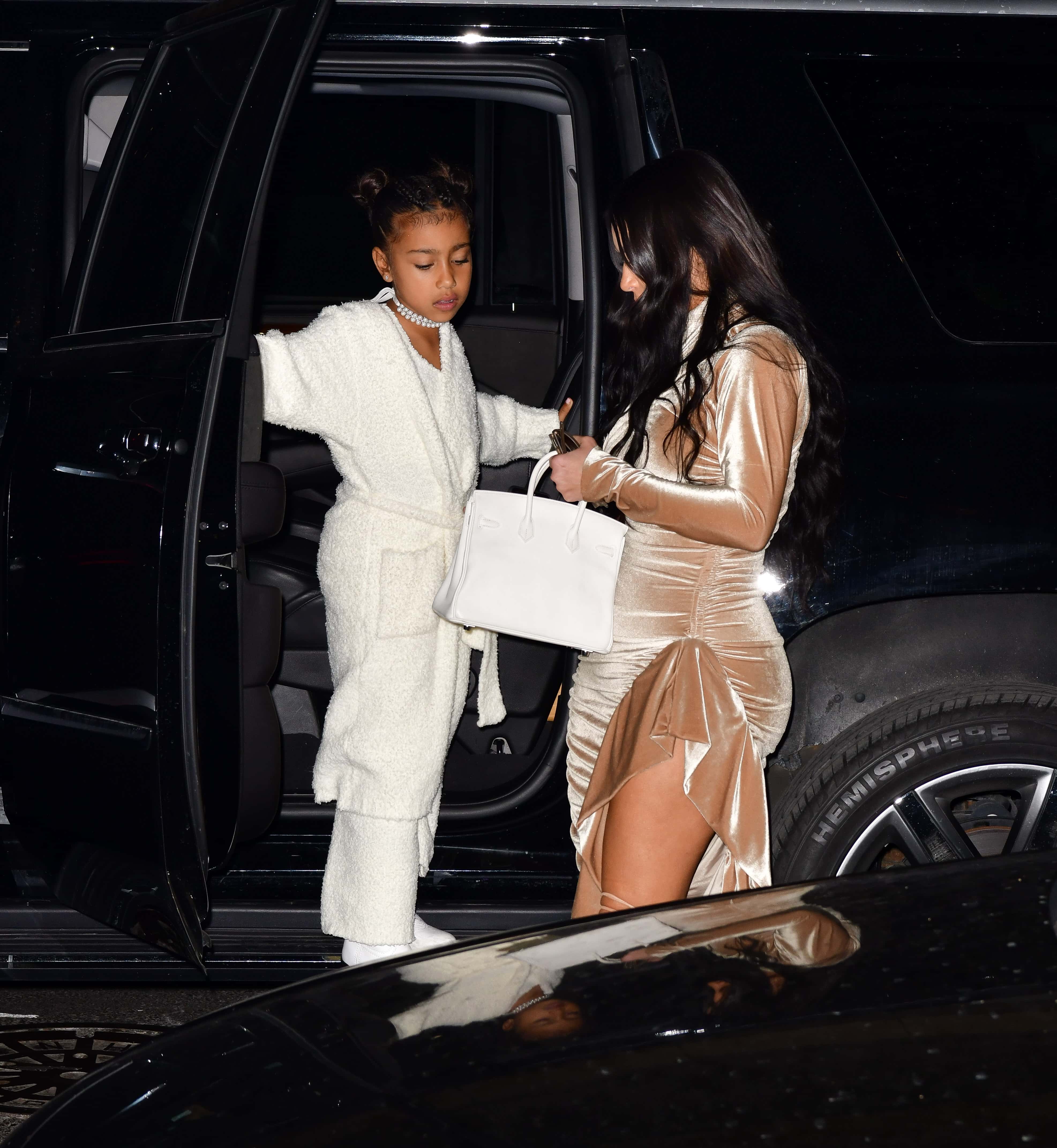 North had paired the lavish handbag with white boots, a pearl choker, and space bun style hair. She completed the look with a robe customized by Kim Kardashian's clothing brand SKIMS Cozy Collection — she wore a pint-sized version of SKIMS' Cozy Knit Robe ($128) and Cozy Knit Pant ($88).