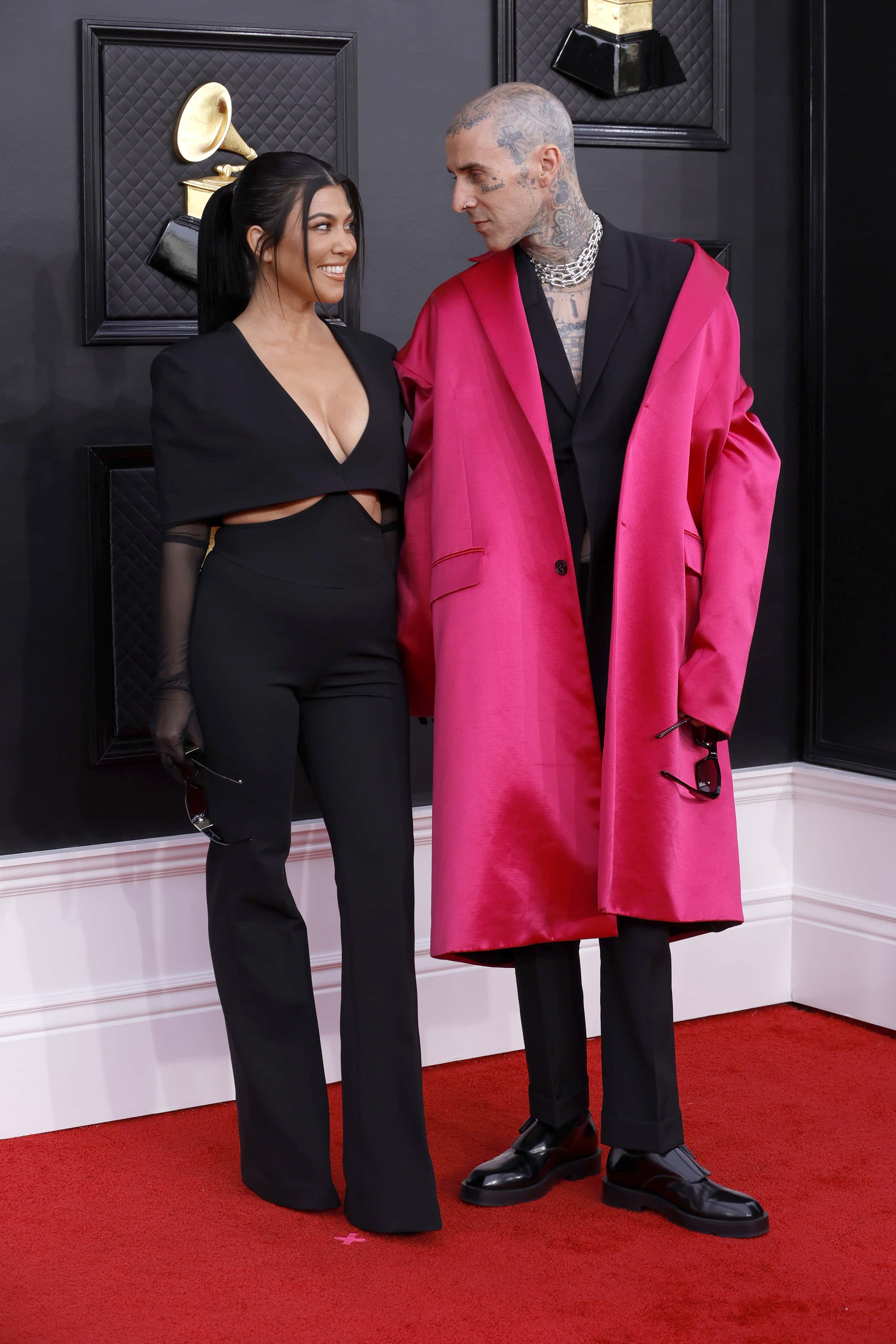 At the Grammys 2022, the couple entered wearing slim black sunglasses. Travis initially entered with a plush looking hot pink satin overcoat. However, he was quick to take the pop of pink off so he could twin with his love Kourtney. When Travis took off his pink coat, the sleevless blazer highlighted the tattoos on his arms. Under the blazer, he was shirtless. His jacket with hidden buttons was matched with classic black trousers and shiny black shoes with buckles. He accessorized with thick silver chains around his neck.