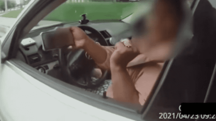 As the officer stated that the woman "can't be on her mobile phone when driving" and asks to see her identification, the driver responded, "It's at my place, and I am perfectly legal and a teacher."