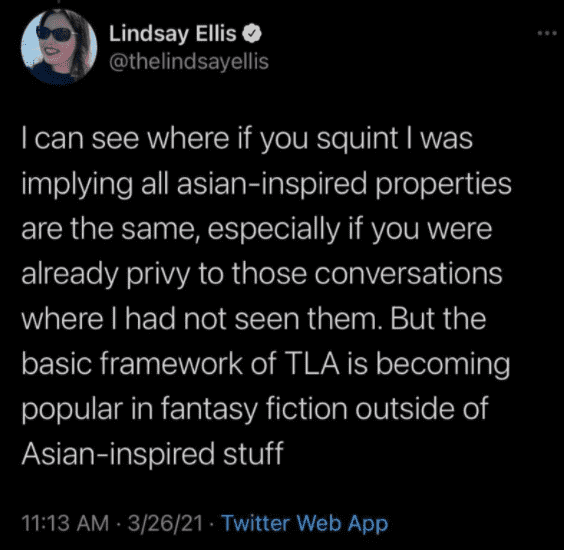"I can see where if you squint I was implying all Asian-inspired properties are the same, especially if you were already privy to those conversations where I had not seen them. But the basic framework of TLA is becoming popular in fantasy fiction outside of Asian inspired stuff," Lindsay tweeted later, possibly in an effort to explain her earlier tweet, which some thought exhibited a lack of "research."