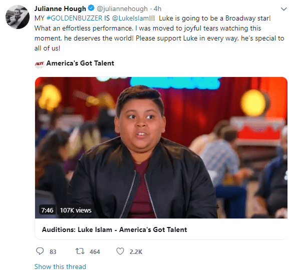 Fans also appreciated Julianne's decision to hand out the golden buzzer to Luke. A fan tweeted saying, "That is a Broadway voice with the power and energy and emotion to succeed!" While another wrote, "Infinite love and gratitude! Thank you for sharing your amazing voice. Looking forward to seeing more of you and buying a ticket for your Broadway show!!"