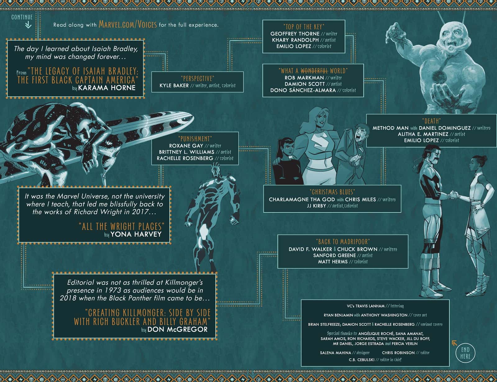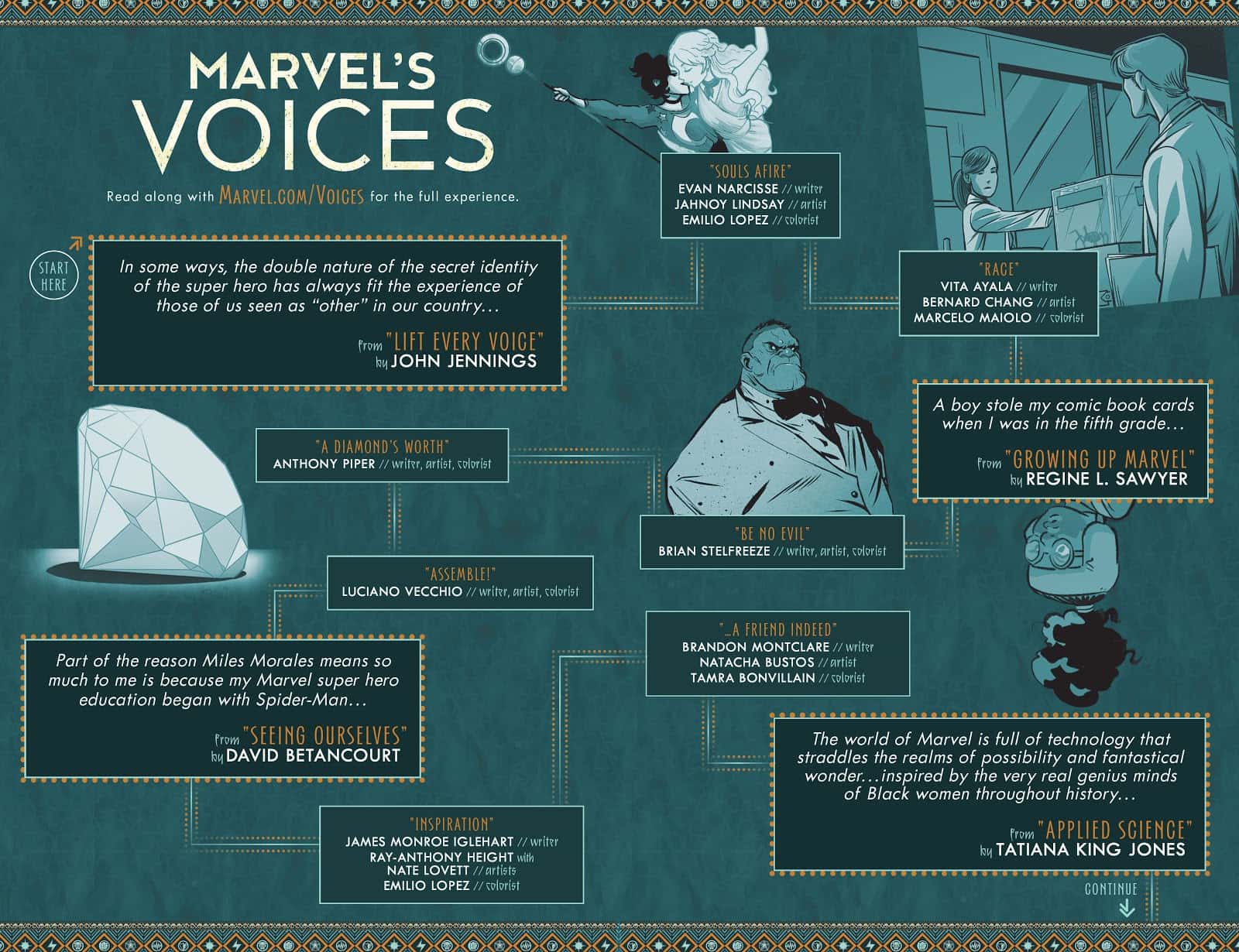 Instead of an index page, 'Marvel Voices' #1 has an infographic with a recommended reading order, splitting your time between the comic stories and the online essays somewhat evenly. One can imagine future issues possibly including a playlist for a fully immersive experience.