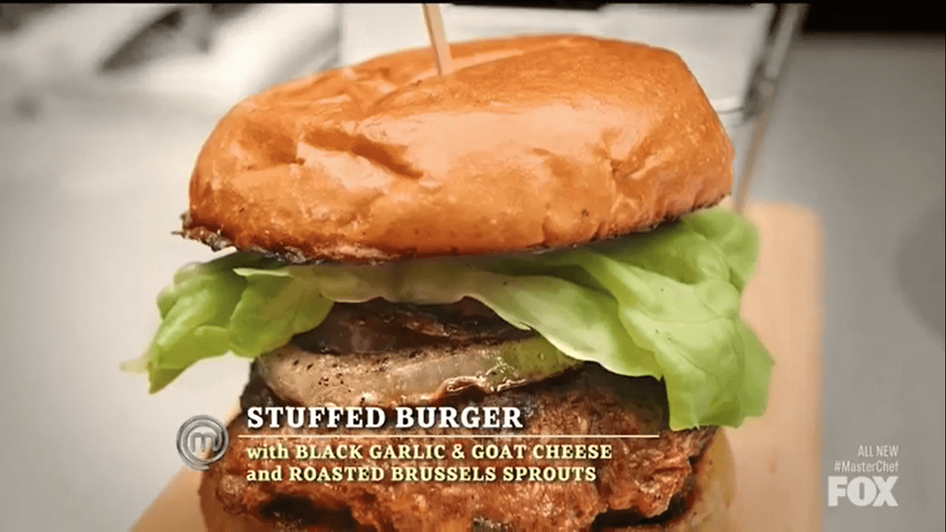 When he asked her how she managed to pull it off, she explained that her limited resources forced her to be creative and resourceful when it comes to cooking. She used those skills tactfully in her signature dish, a burger. She made a stuffed burger with black garlic and goat cheese. She served the burger with a side of roasted brussels sprouts instead of fries. The judges made it clear that the burger would have to be exceptionally good for her to get the apron.